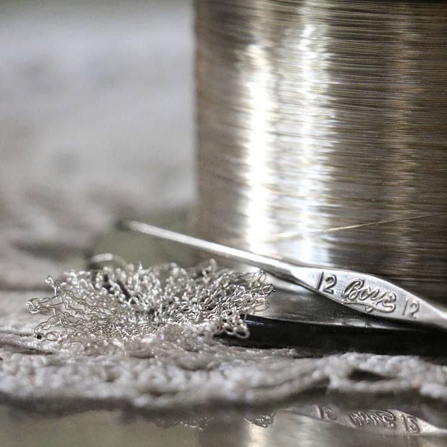 Each piece is crocheted using recycled fine silver wire, antique hand tools, and traditional techniques passed down through the generations since the 1830s.