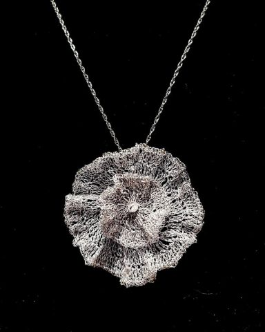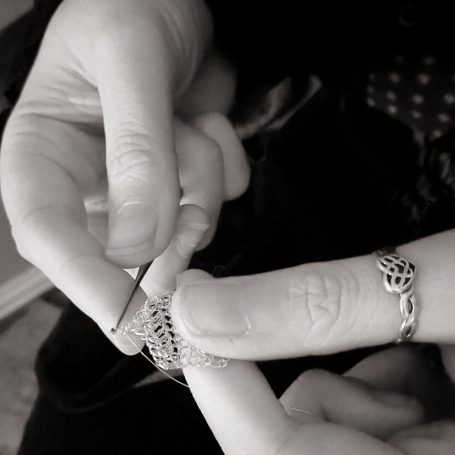 A form of crocheting, this process produces a lace-like appearance. Knotting the silver wire in such a way makes the finished product very light, flexible, and durable; a modern reimagining of a timeless heritage craft.
