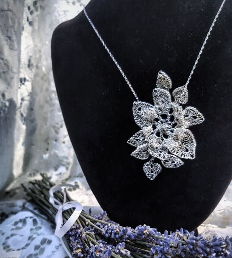 When I sit down to create I usually sketch out my idea then turn the drawings into a geometric pattern, resembling a crochet chart, to bring to life in Silver wire. For more complex designs, I will often create a prototype in cotton to test the pattern. I find it really connects me to the heritage of the craft and makes me appreciate those who paved the way all those hundreds of years ago.